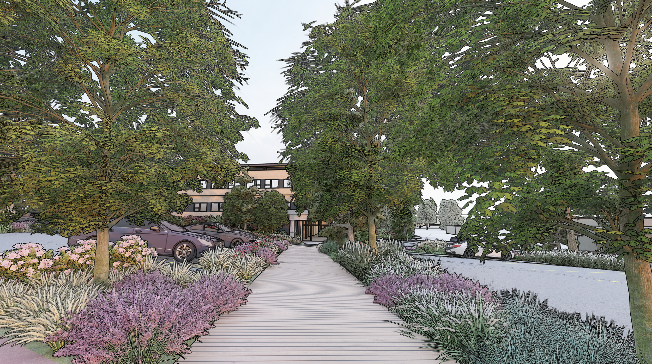 This is the heart of the outdoor community space located north of the building and ’behind’ the building. A raised wooden platform presents a gathering circle that people can join or for a larger group expand into the pathways surrounding it. A pollinator garden that doubles as a rain garden captures the pond overflow found in the foreground. There are 4 tiers of rain gardens that capture overflow from the roof and surrounding areas that effectively slow down or eliminate any water going into the city storm drain.