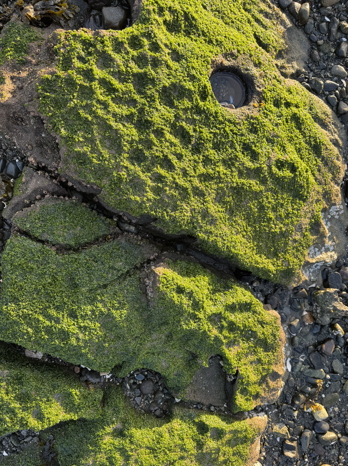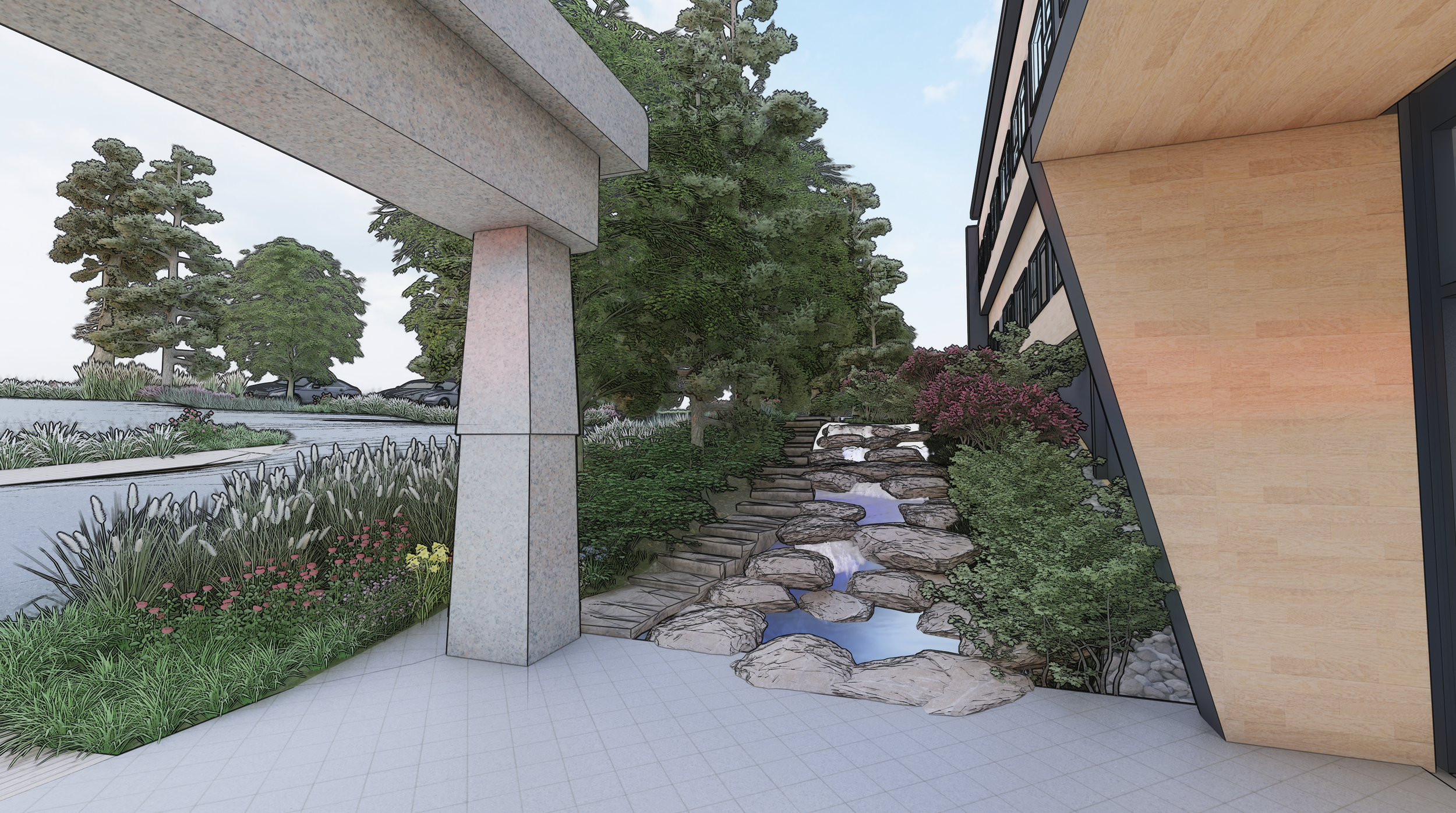 The view from the north exit into the private community gathering space. The pond is ephemeral and created by roof capture water. Once the pond is full, it overflows into the adjacent rain garden. There are three more rain gardens along the slope to gather overflow until any excess is sent to the city sewer.